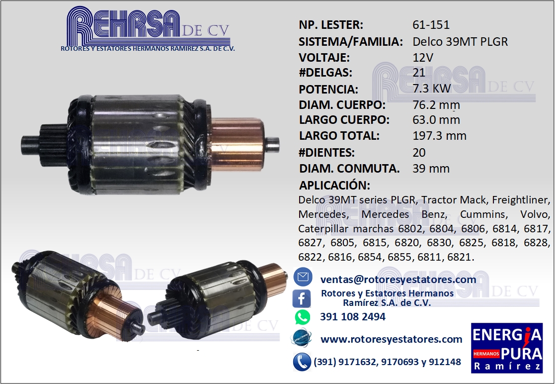 Armadura Delco 39MT 12V Delco 39MT series PLGR, Tractor Mack, Freightliner, Mercedes, Mercedes Benz, Cummins, Volvo, Caterpillar marchas 6802, 6804, 6806, 6814, 6817, 6827, 6805, 6815, 6820, 6830, 6825, 6818, 6828, 6822, 6816, 6854, 6855, 6811, 6821.