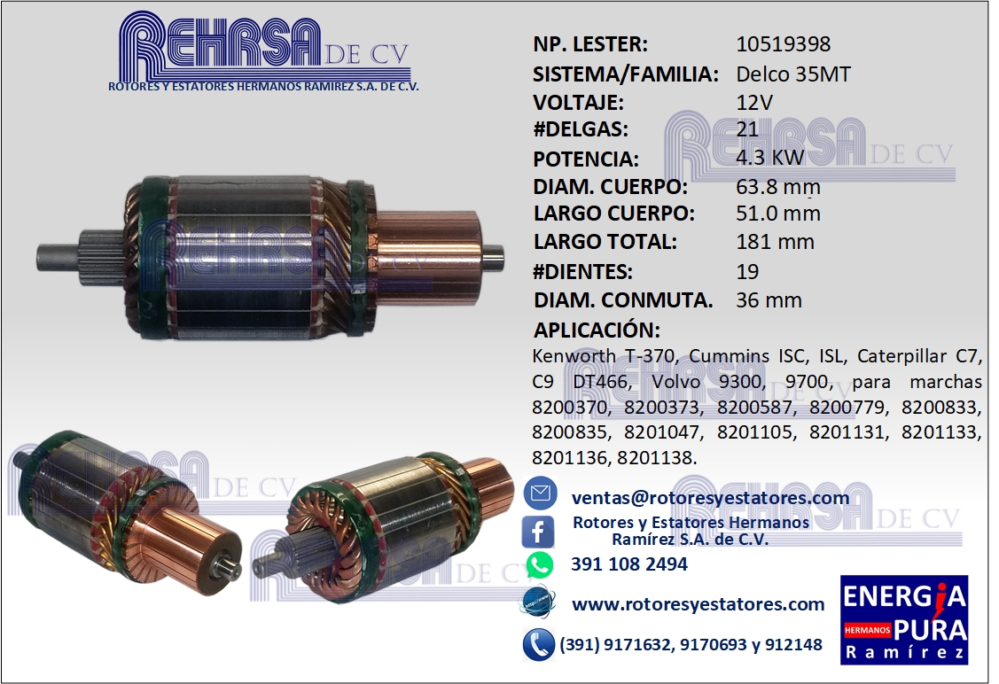 Armadura Delco 35MT 12V Kenworth T-370, Cummins ISC, ISL, Caterpillar C7, C9 DT466, Volvo 9300, 9700, para marchas 8200370, 8200373, 8200587, 8200779, 8200833, 8200835, 8201047, 8201105, 8201131, 8201133, 8201136, 8201138.